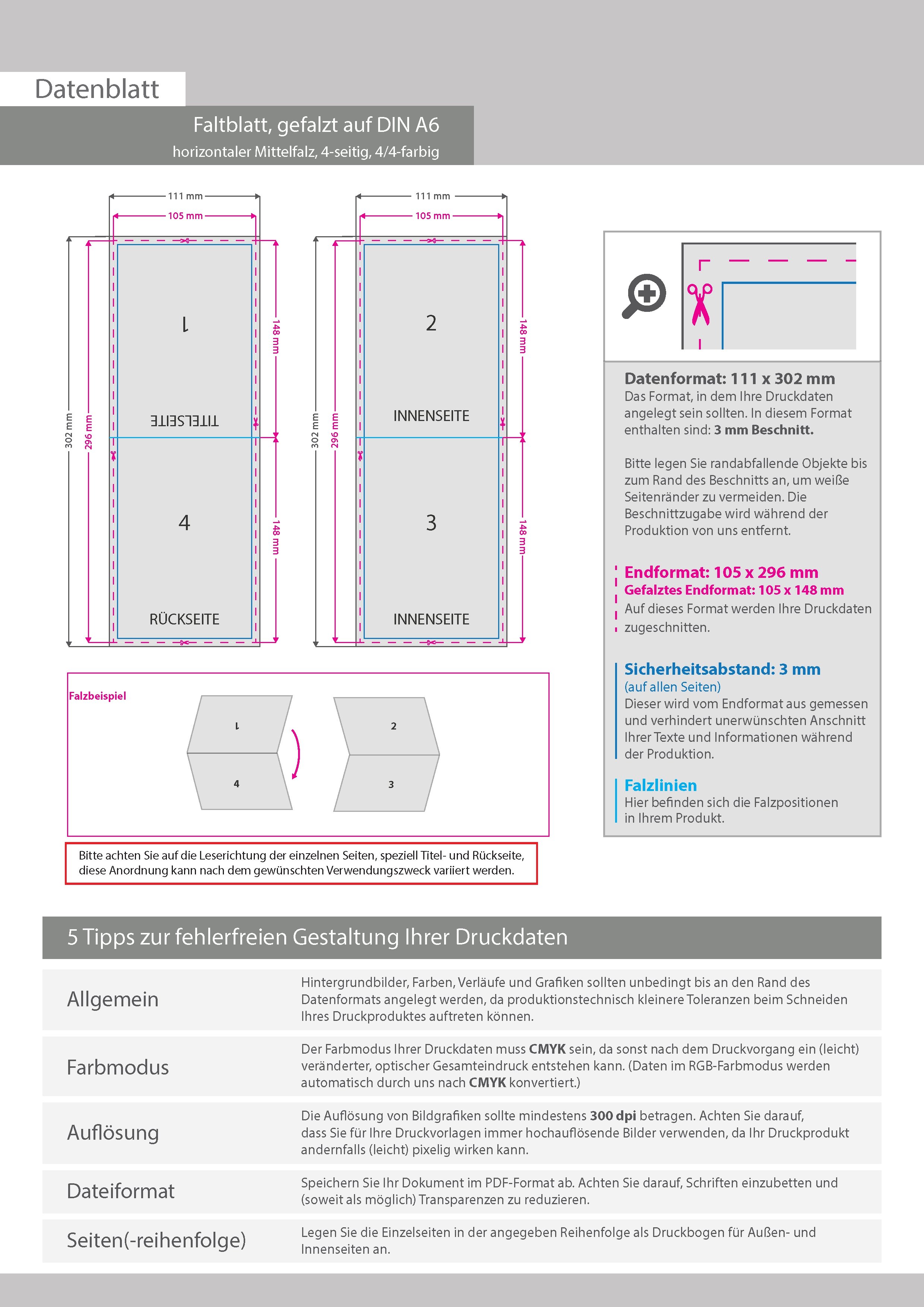 Faltblatt, gefalzt auf DIN A6, horizontaler Mittelfalz, 4-seitig